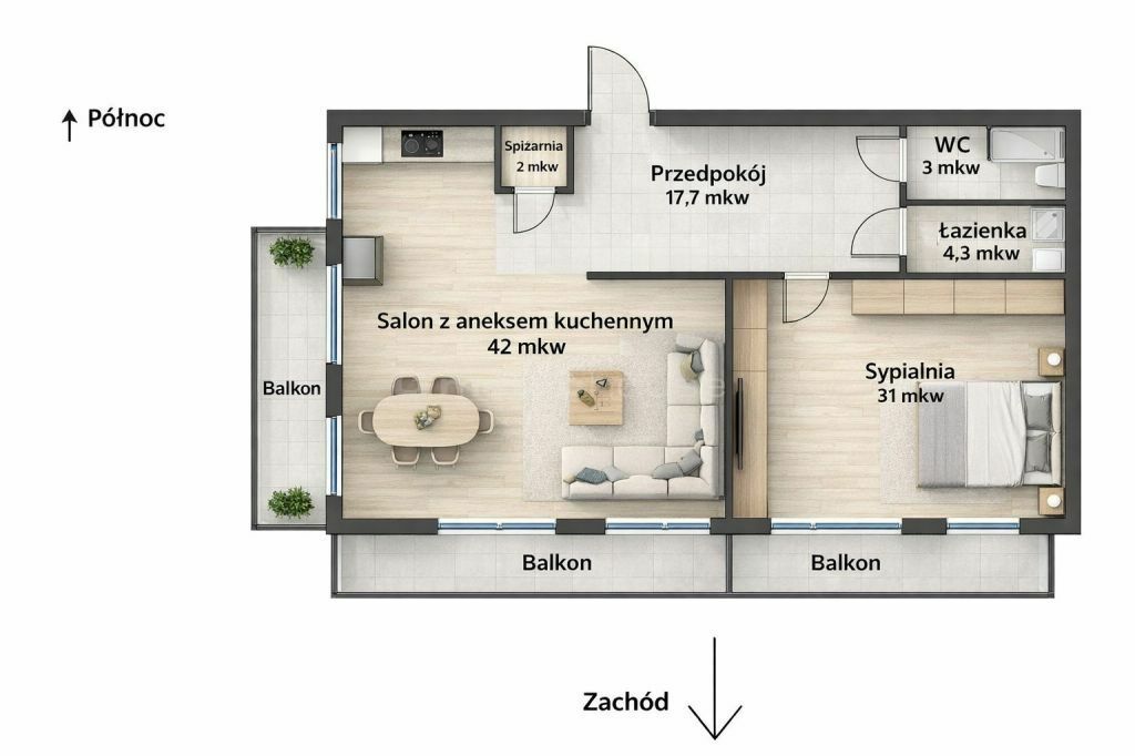 Trzy balkony stanowią naturalne przedłużenie przestrzeni, oferując światło, oddech i możliwość relaksu o każdej porze dnia.