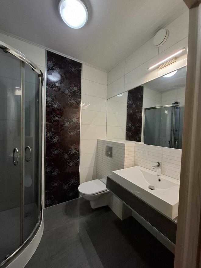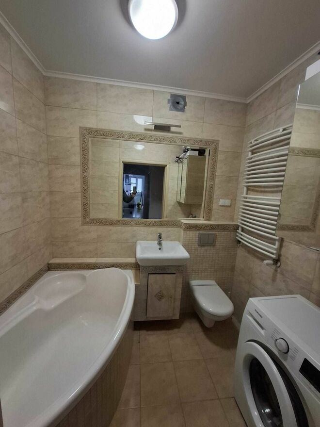 W części dziennej znajduje się jedna z łazienek (ta z kabiną prysznicową) W części tzw. nocnej, obok sypialni znajduje się druga, duża łazienka z wanną narożną.