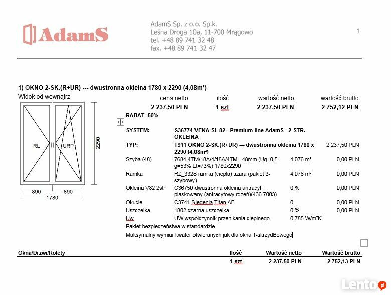 Sprzedam Okno AdamS na profilu Veka 82 SL - dwustronny antracyt, rozmiar 1780 x 2290 mm.Dwuskrzydłowe, nowe.