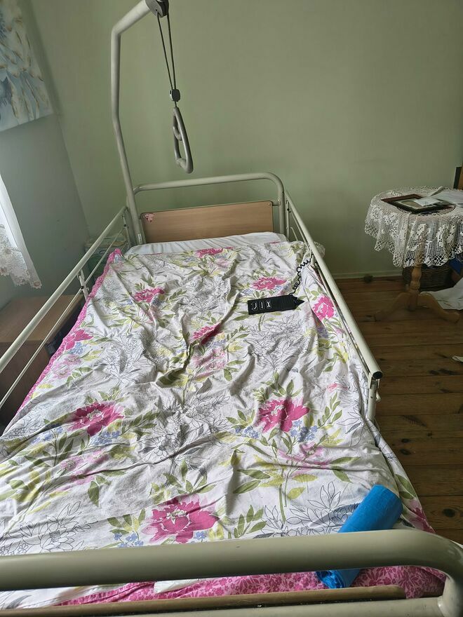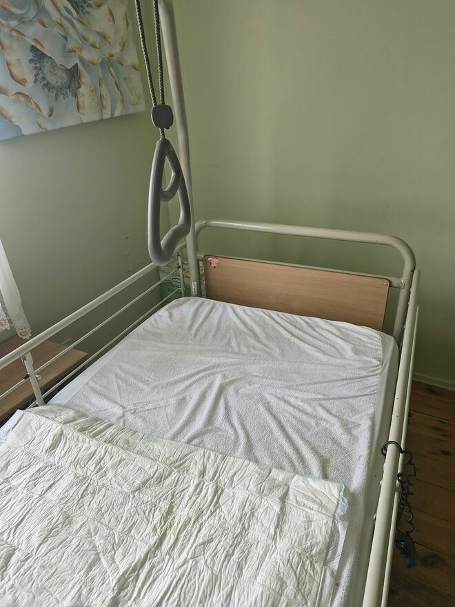 Oferuję na sprzedaż używane łóżko dla osoby leżącej ze sterowaniem podnośnikami za pomocą panelu. Stan łóżka oceniam jako dobry. Łóżko ma kółka, które można zablokować, dwie zdejmowane barierki oraz mocny stelaż. Odbiór osobisty w Radomiu na ulicy Podleśnej.