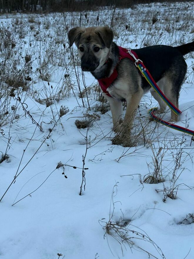 Stokrotka ma około 6 miesięcy, waży ok. 10 kg i raczej będzie średniej wielkości.